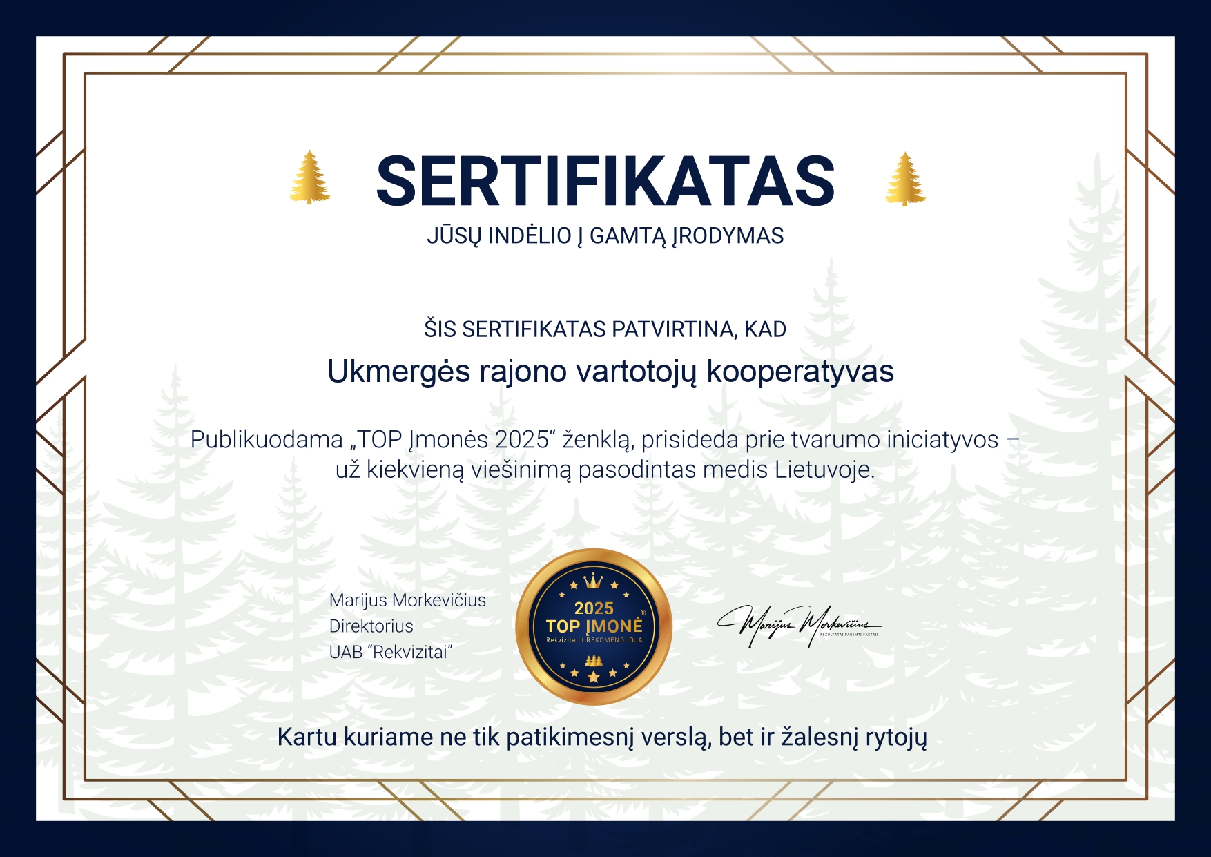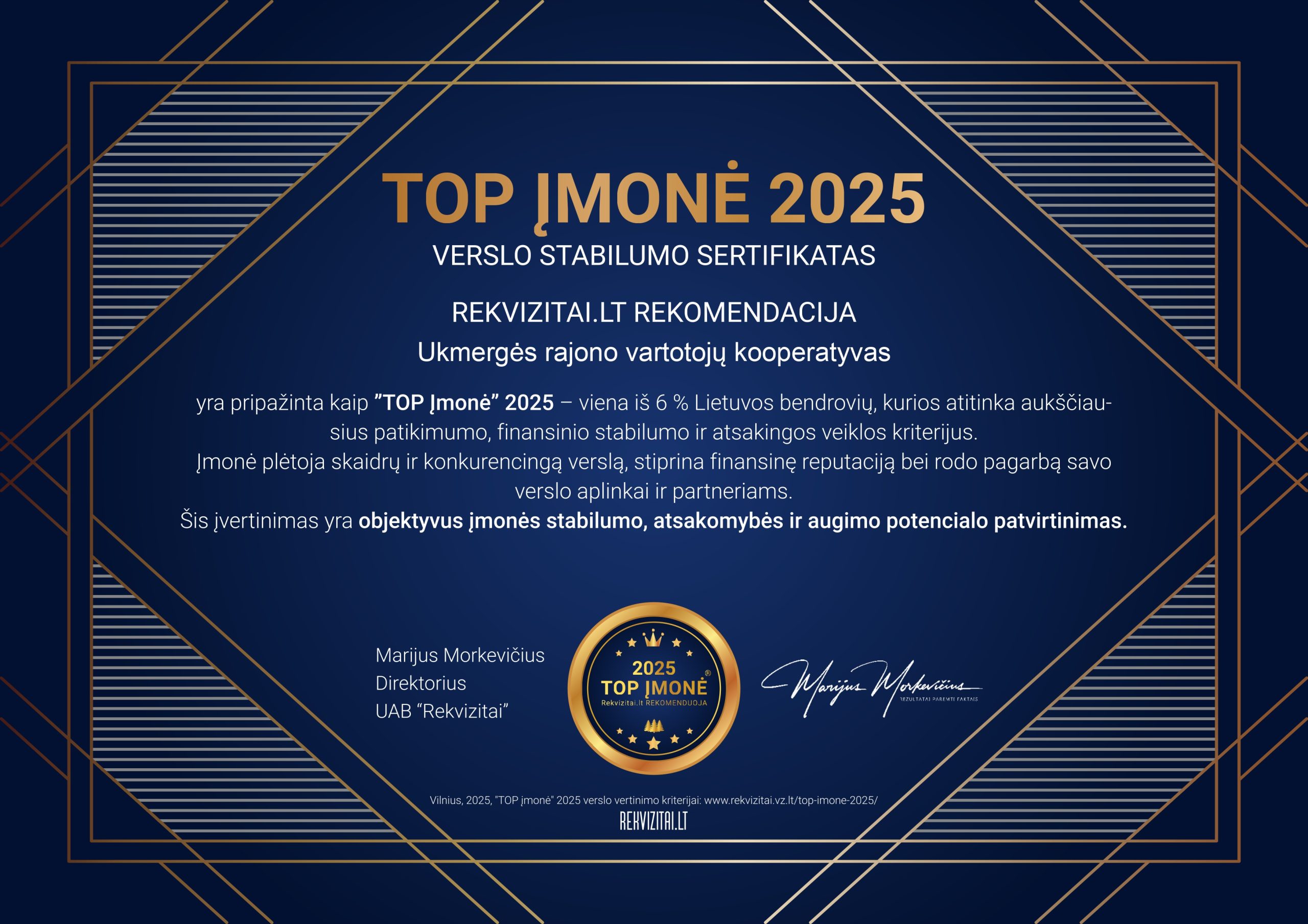 Gavome SERTIFIKATĄ, kuris patvirtina mūsų ilgalaikę sėkmę veiklos sektoriuje ir mūsų įmonės apyvartos rėžyje!